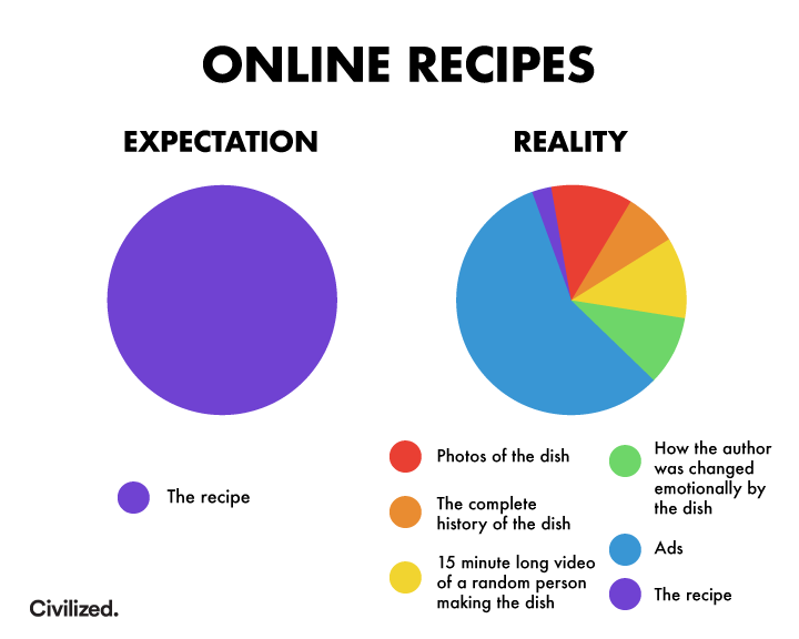 To the people who post recipes online: No one gives a crap about how your grandmother used to clean her oven or that your 5th cousin is from Bulgaria and that’s where the recipe came from. We just need the damn ingredient list. We’re tired from being at work all day and we don’t want to touch anything more in Kroger than we have to, so stop making us scroll with grocery store-COVID fingers. We just want to cook without ads popping up that we have to close with raw, chicken covered-fingers.