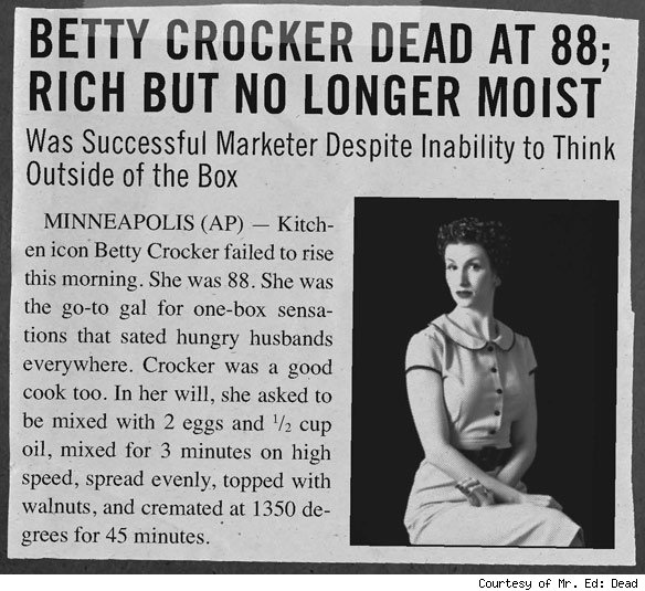One of my favorite things to do is read the obituaries. Not because I morbidly enjoy hearing that people have died, but because trying to get a sense of who someone was in 100 words or less is a fascinating exercise. Most of the time, obits are pretty boring, with endless lists of surviving relatives, no cause of death, and lists of clubs or activities trying to convey the dignity of the person who passed.